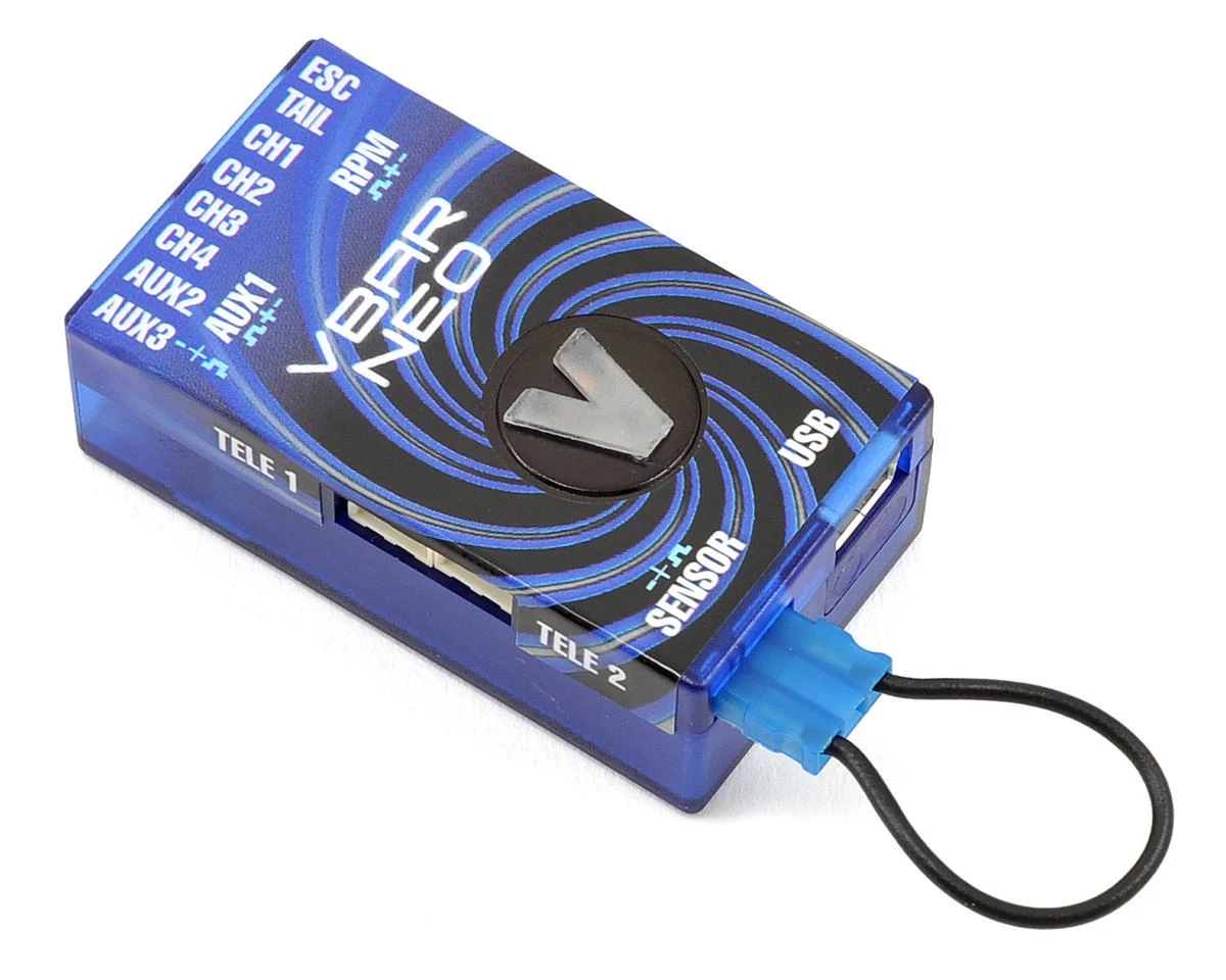 This is the Mikado VBar NEO, with 6.1 Express Software. The Mikado VBar NEO is the successor of the incredible VBar Mini and high performance VBar Silverline. The NEO uses the latest sensor tech and top processing power to elevate VBar performance to the next level. The NEO has a footprint that is slightly larger than the VBar Mini, combined with the connectivity of a Silverline system, with 9 fully usable servo outputs, an RPM sensor input, a connector for an external sensor, two telemetry ports, and an integrated USB port.
