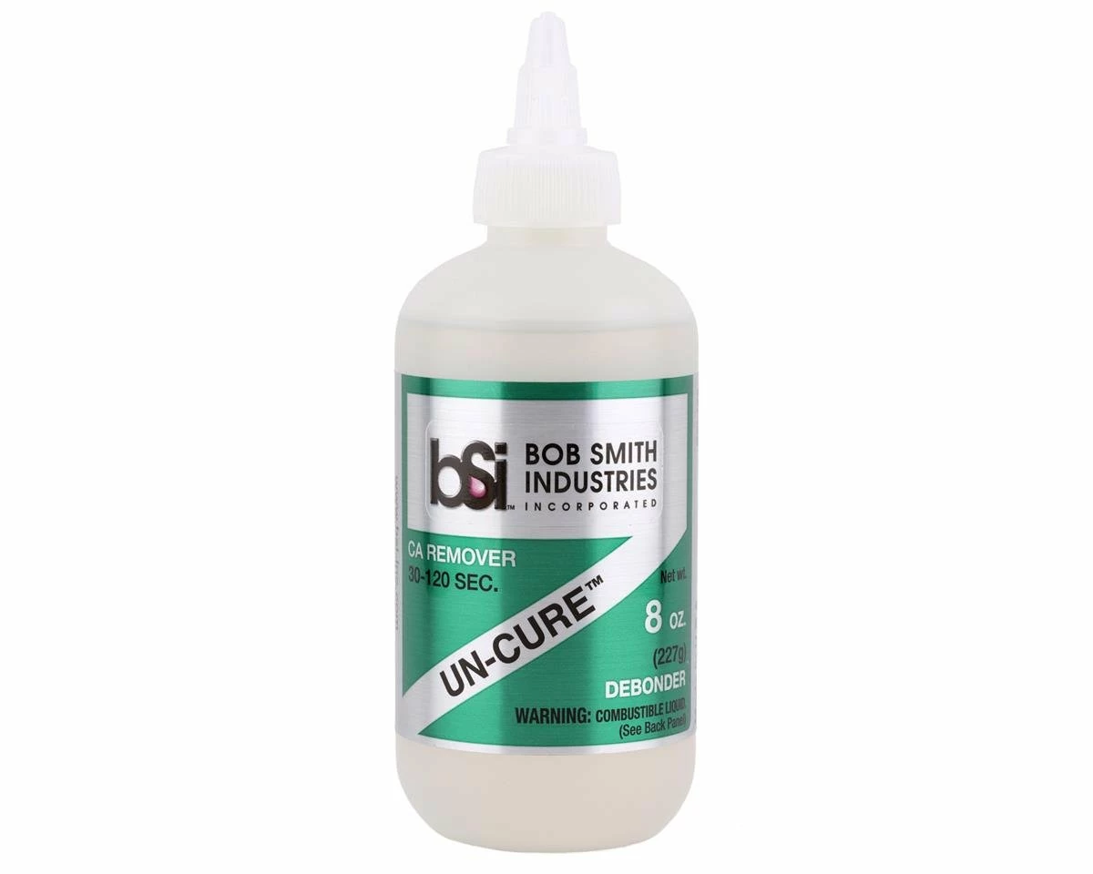 This is a four ounce bottle of Bob Smith Industries UN-CURE CA Debonder. UN-CURE Debonder will soften cured CA. If parts are bonded incorrectly or your fingers are stuck together, a few drops of UN-CURE will dissolve the CA in about a minute. Apply on bonded skin and roll apart fingers. Once stuck, use acetone to clean off softened CA, then wash off with soap and water.
