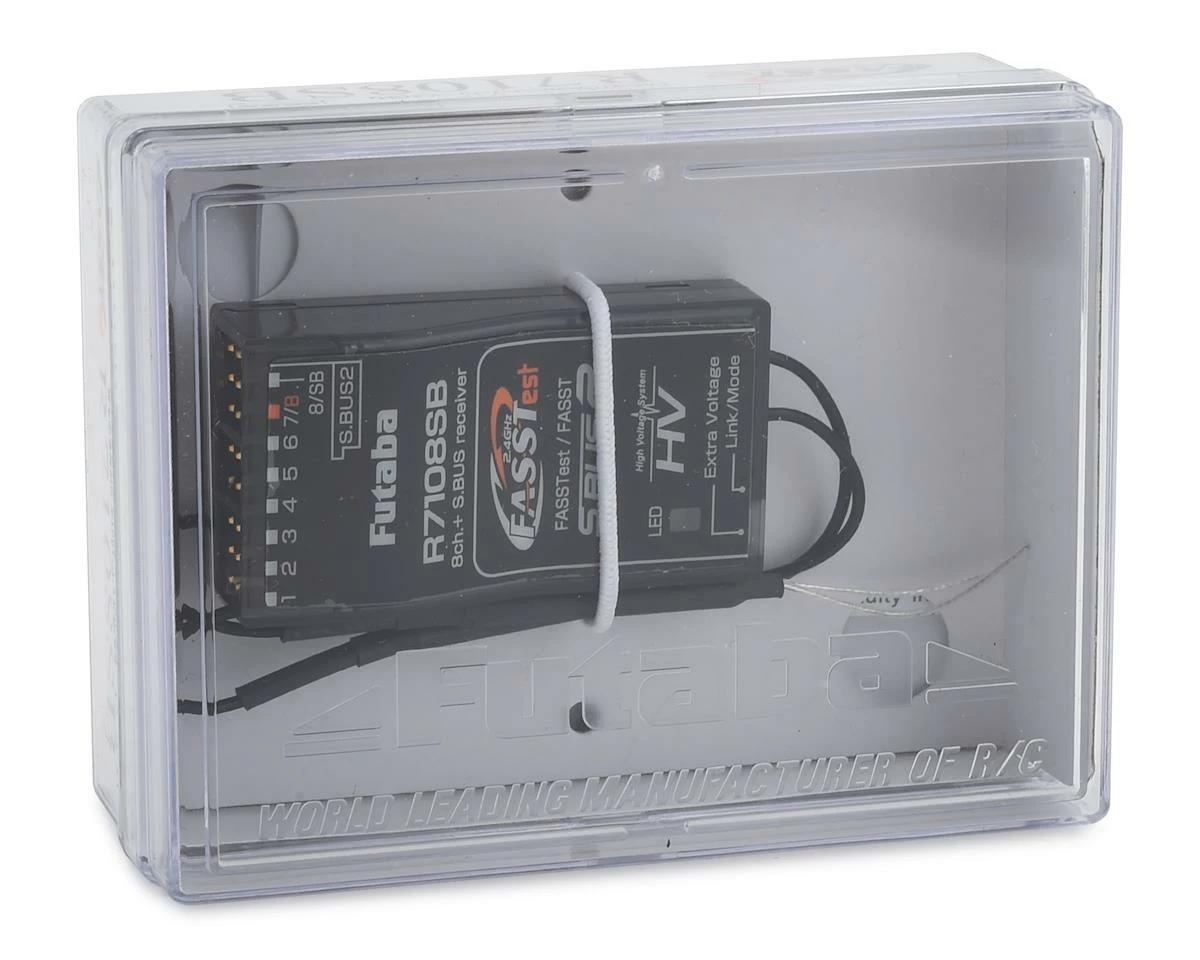 This is theΒ Futaba R7108SB 2.4GHz FASSTest 8+ Channel High-Voltage Receiver for the 32MZ, 18MZ, 18SZ, 16SZ andΒ 14SGRadio System. The 7108 receiver features SBUS and SBUS2 and when used with the Smart Bus SRS system will provide up to 18 input channels with full SBU2 telemetry support for battery monitoring of voltage, current and mAH.