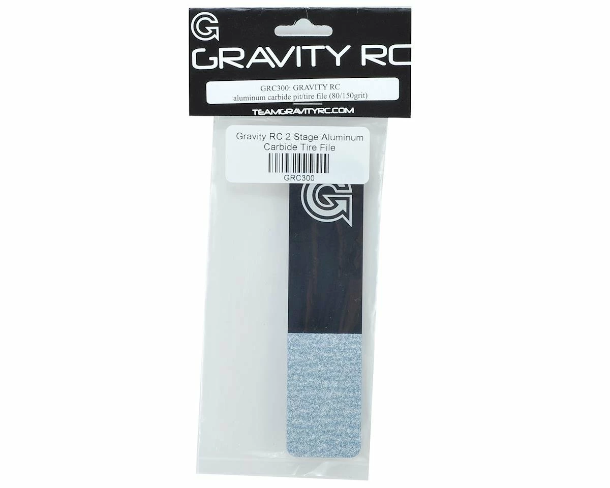 The Gravity RC 2 Stage Aluminum Carbide Tire File is double sided with 80grit carbide abrasion on one side and 150 grit carbide abrasion on the other. The handle is anodized aluminum with laser engraving, works great for filing or chamfering almost anything. Other popular uses have been breaking in off road tires and smoothing and rounding foam tires.