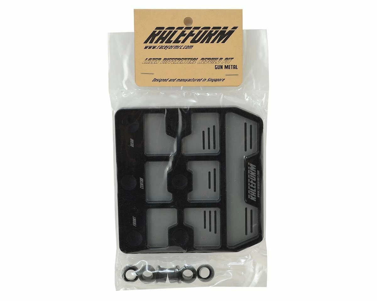 The Raceform Lazer Differential Rebuild Pit is designed to make 1/10 and 1/8 scale diff maintenance easier. The design allows compatibility with all cars, and the compartments inside the tray have milled slots to hold shims and o-rings, making them easier to grab from the tray.