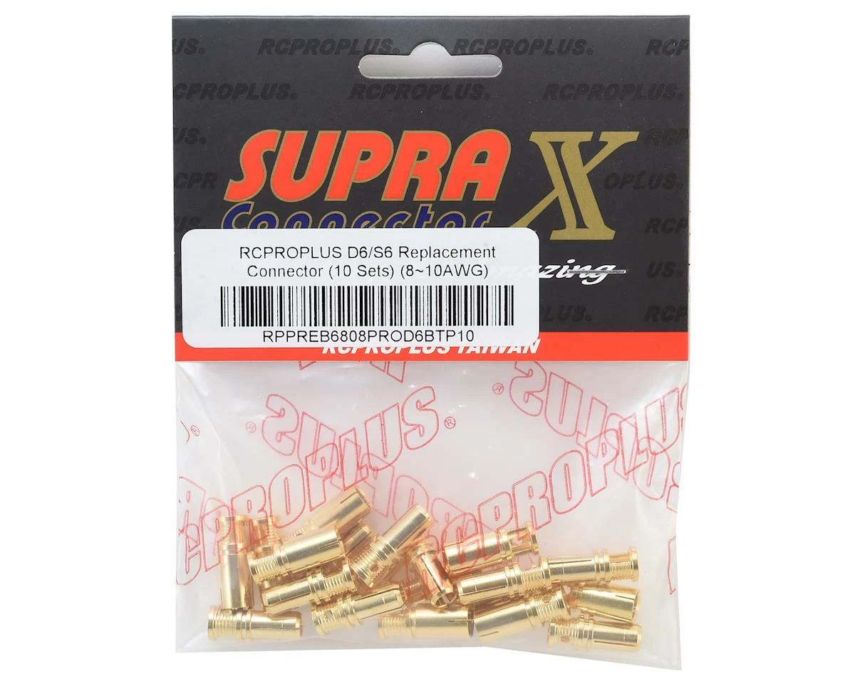 This is a package of ten sets of RCProPlus D6 & S6 Bullet Connectors. Over time the bullet connectors suffer damage from voltage sparks that deteriorate connectivity between female and male connectors. This is an excellent way to ensure your model is performing to the best standards possible!