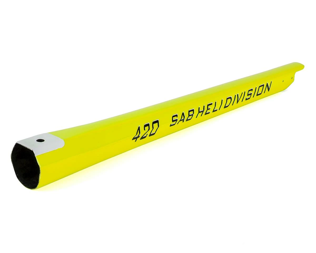 This is a replacement SAB Carbon Fiber Tail Boom, in yellow paint, suited for use with the Goblin 420 helicopter.Β