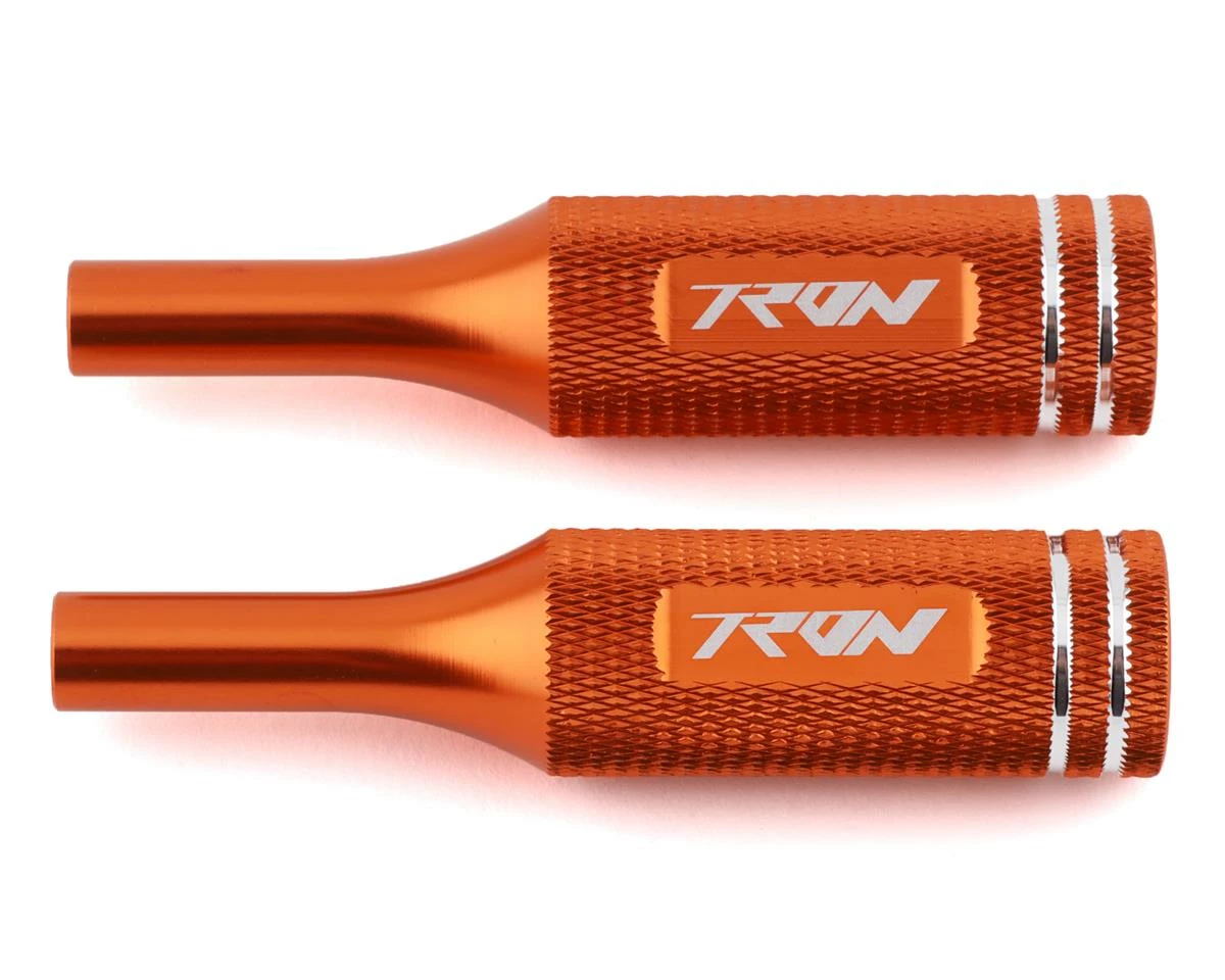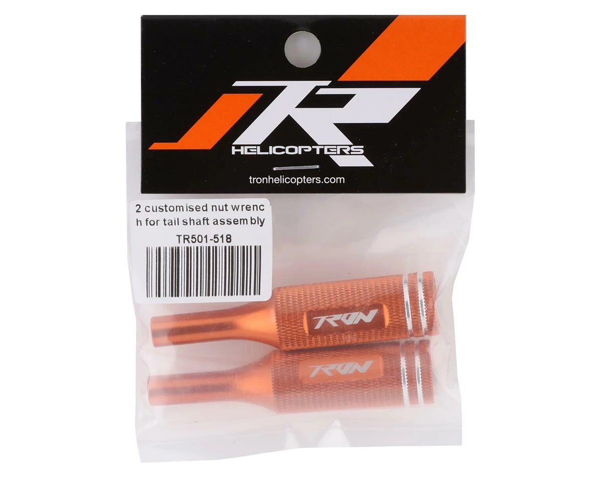 This is a pair of Tron Helicopters 5.5mm Nut Wrenches. These are used for the tail rotor grip assembly, which utilizes locknuts to secure the grips together on the tail spindle shaft. Due to the narrow grip design, these tools were specifically produced to ensure proper assembly and ease of repairs.