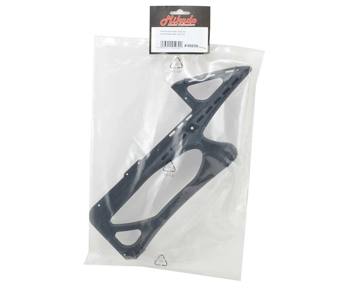 A replacement Carbon infused Plastic Lower Right Side Frame from Mikado, suited for use with the Logo 700 helicopter.Β