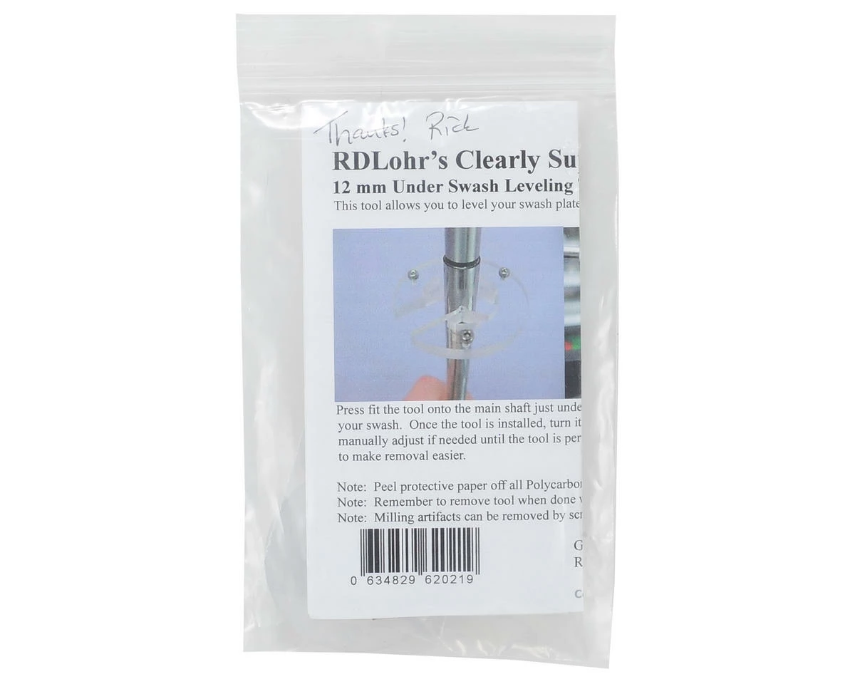 This is the RDLohrs 12mm Under Swash Leveling Tool. This simple tool will allow you to level your swash plate WITHOUT removing the head! The Under Swash tool is a must have for your field box! Clip it onto the main shaft just under the swash plate and it provides a level surface to use as a reference while leveling your swash. This CNC milled tool is extremely accurate, and the polycarbonate material will not scratch your machine.