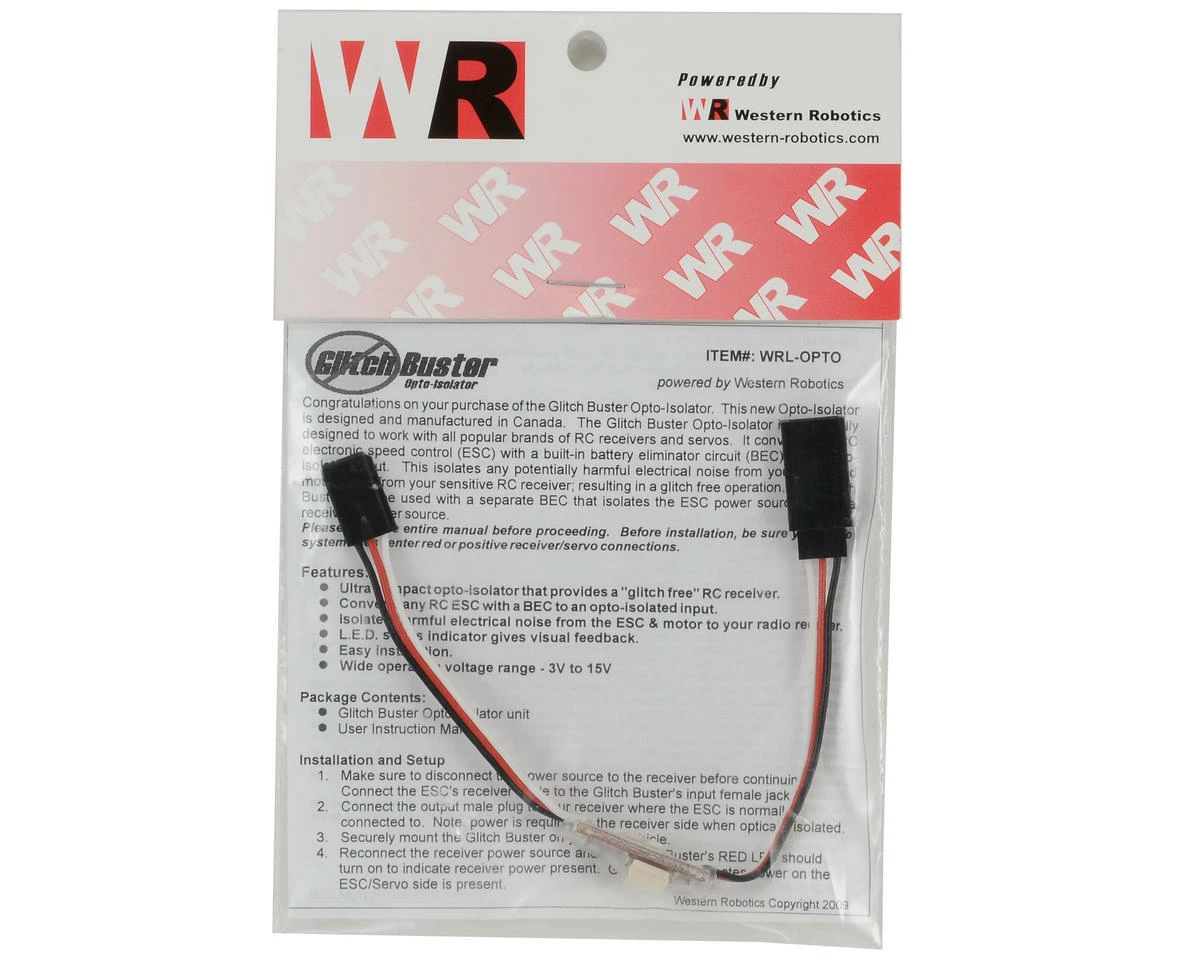 This is the Western Robotics GlitchBuster Opto-Isolator. The GlitchBuster Opto-Isolator is designed to work with all popular brands of R/C receivers and servos. It converts any R/C electronic speed control (ESC) with a built-in battery eliminator circuit (BEC) to an opto-isolated input. This isolates any potentially harmful electrical noise from your ESC and motor away from your sensitive R/C receiver; resulting in a glitch free operation. The Glitch Buster is to be used with a separate battery pack/BEC that isolates the ESC power source from the receiver’s power source. It is also equipped with male and female plugs for easy installation.