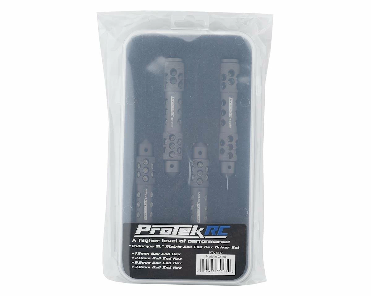 The ProTek R/C “TruTorque SL” Metric Ball End Hex Driver Set features largeΒ 20mm diameter handles with machined relief holes and cross hatch knurling to reduce weight and provide a high grip surface. The end of the handle features a rotating end cap that allows the tool to spin in your palm, maximizing comfort during long wrench sessions. Plus, the tip size is laser etched in not one – but theΒ THREEΒ different spots on the handle to help simplify identification.Β