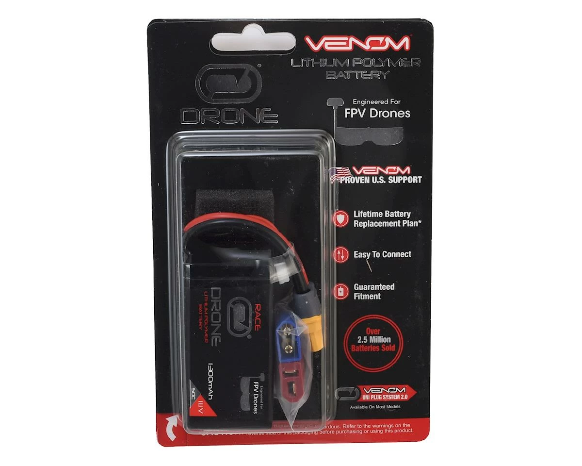 Venom DRONE FPV Race packs include the patented UNI 2.0 plug system (patent no. 8,491,341), utilizing a true Amass XT60 connector that easily attaches to the included Deans and EC3 adapters giving you ultimate connectivity. Venom DRONE FPV race packs have the reliability, capacity and raw power needed to handle the most demanding race courses.