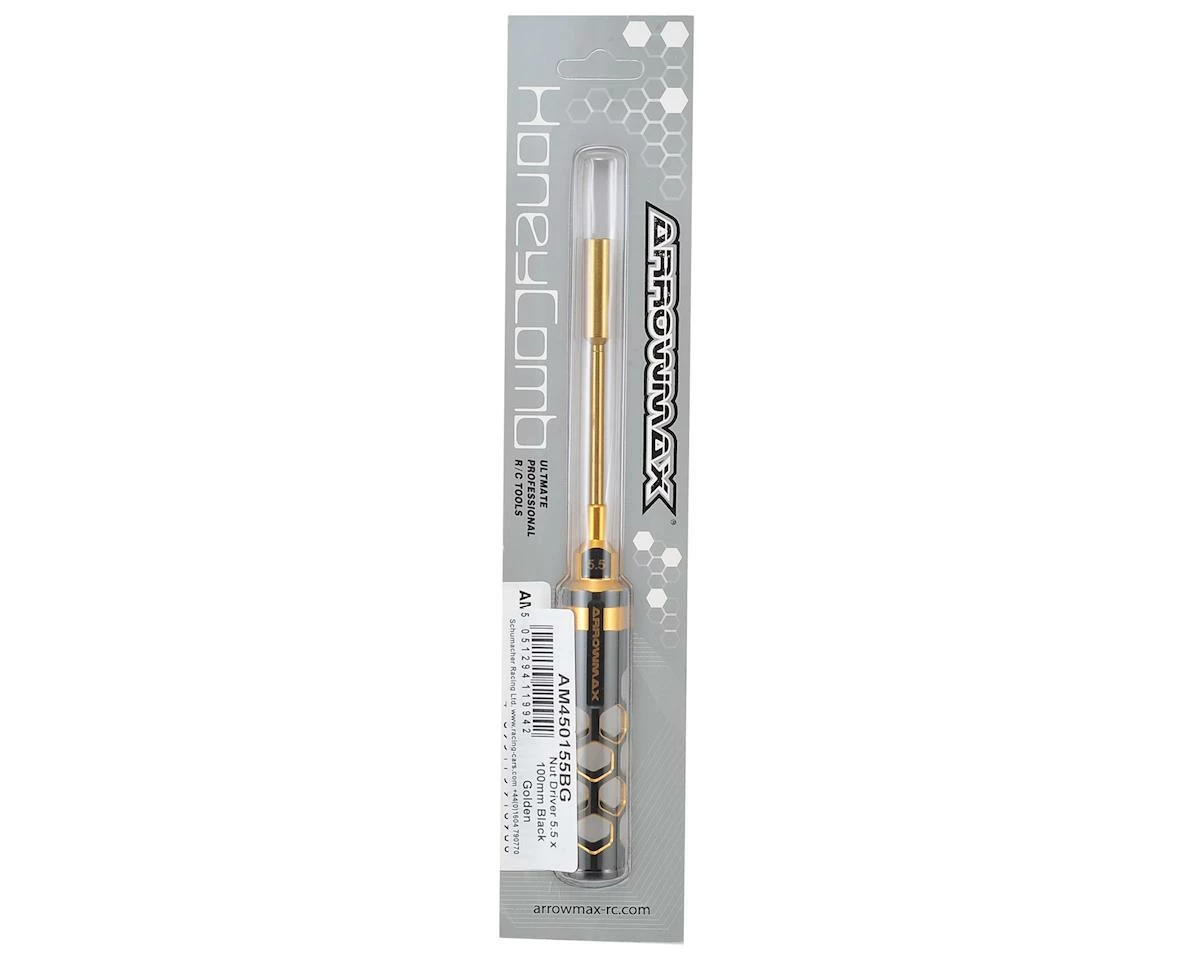 The Arrowmax Black Golden Nut Driver is a limited edition tool that features an eye-catching hollow honeycomb handle design with a rich black and gold color finish. The 100mm long spring steel titanium nitride tip provides durability and long life, while a lexan end cap helps to create a more comfortable, controllable and lighter feeling tool that makes it easier to endure a long wrenching session. Package includes one 5.5mm Nut Driver.