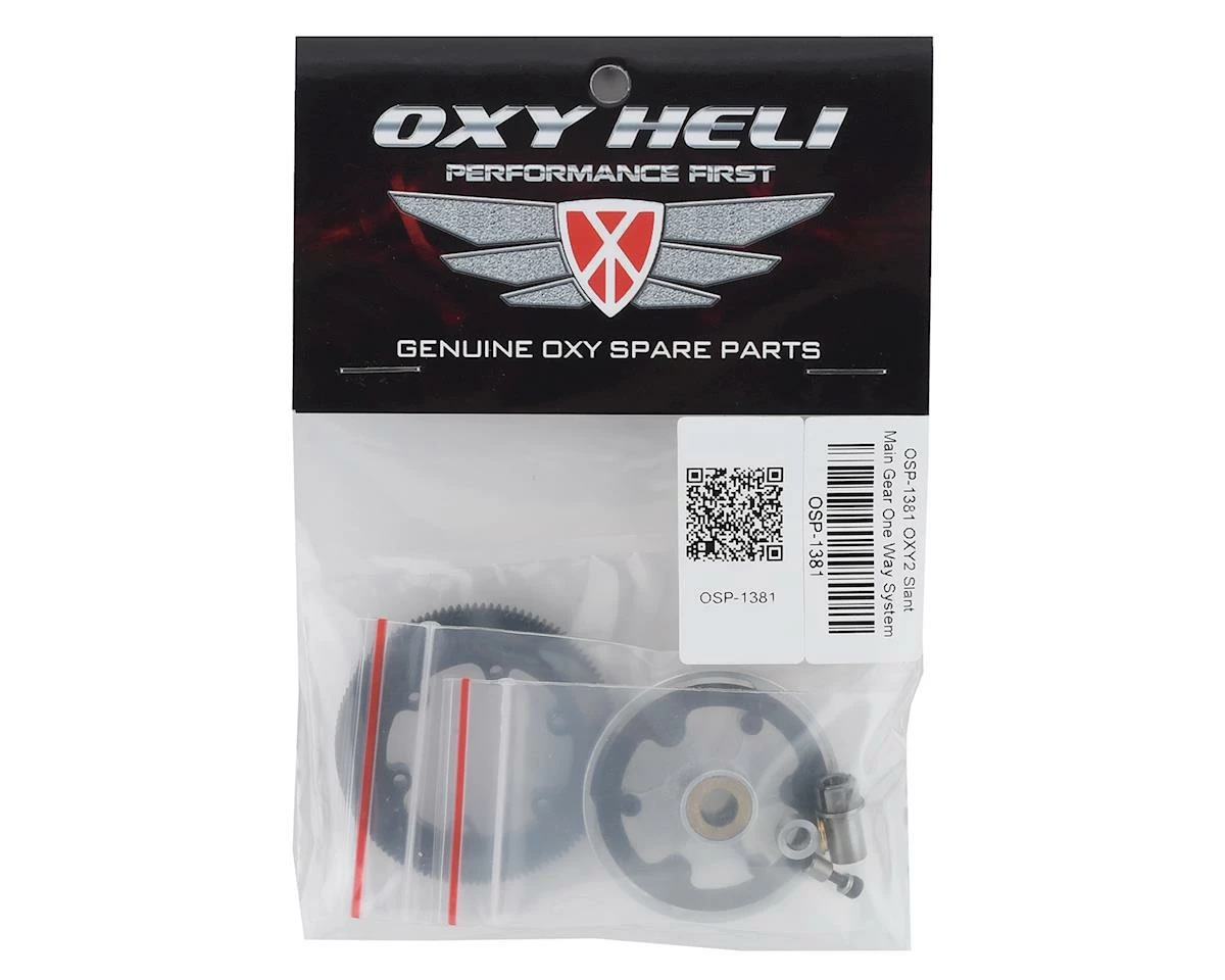 This is an optional upgraded Oxy Heli Main Gear System w/One Way Bearing for the Oxy 2 family of helicopters. Available in Straight or Slant main gears, this upgraded one way system will reduce drag and improve power output on your Oxy 2 heli!