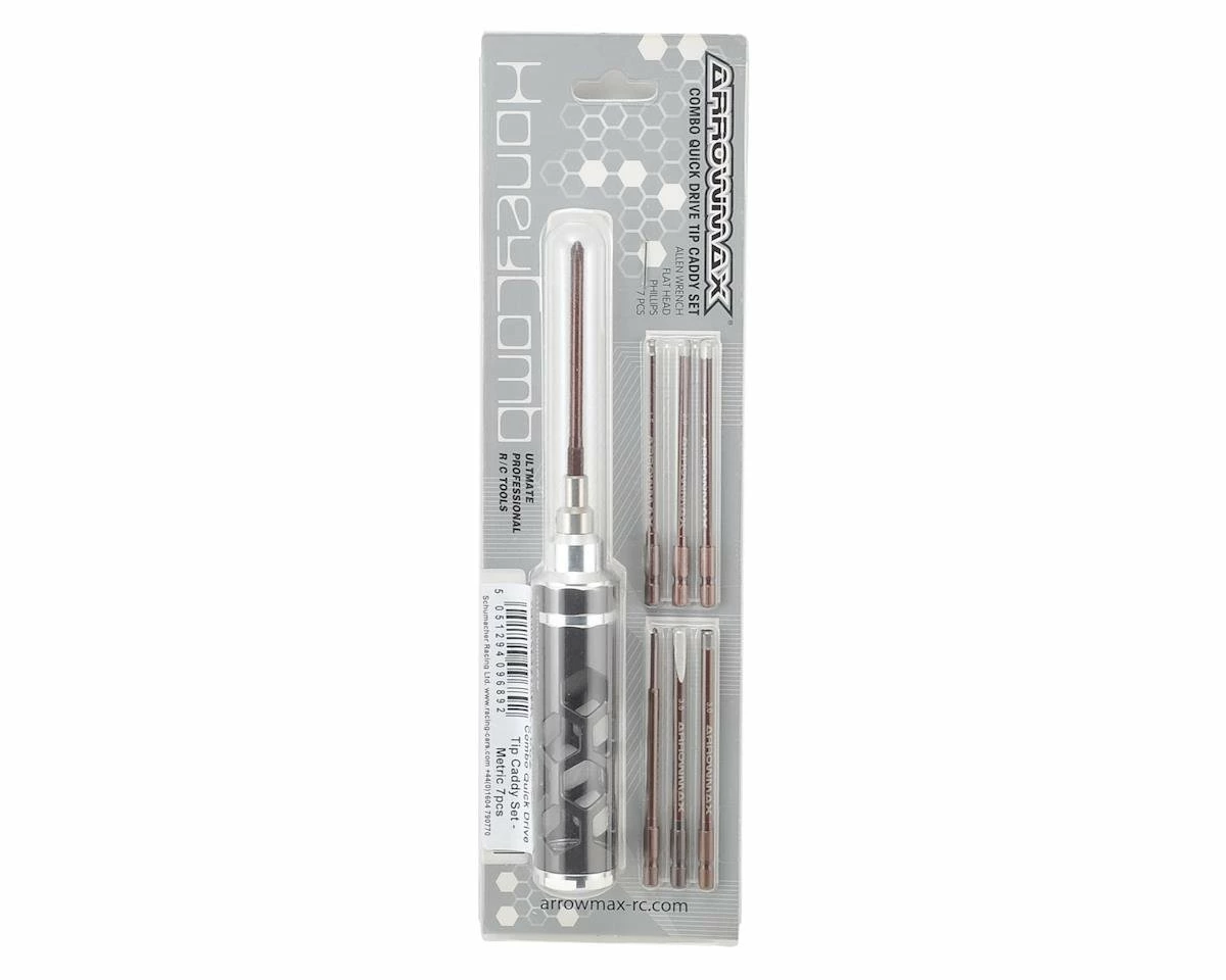 The Arrowmax Quick Drive Metric Tip Caddy Combo Set includes the four most common hex tips, as well as Phillips head and flat head screw drivers, all in 4mm drive, making them compatible with a power drill. A honeycomb machined handle is also included to allow you to use any of the tips like a standard hand tool.