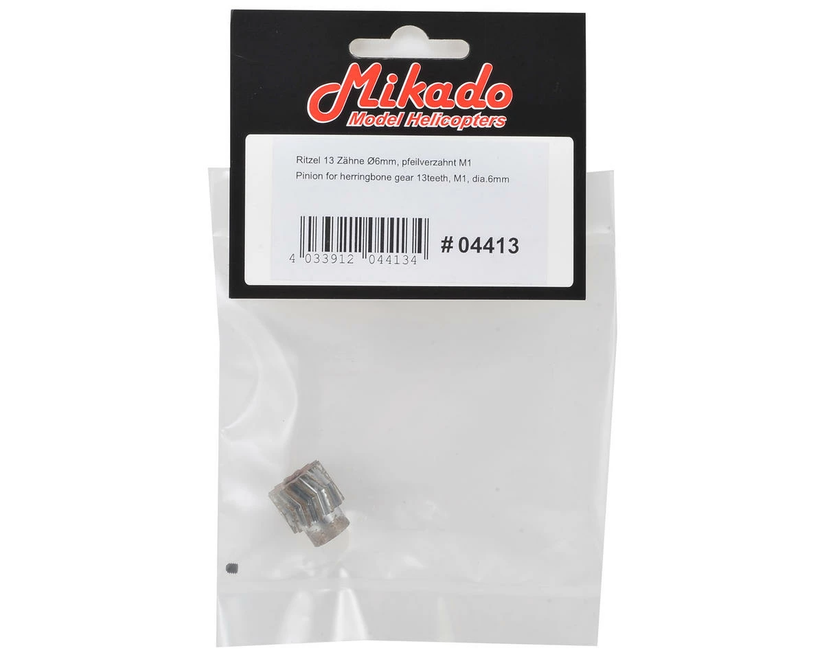 A replacement 13T M1.0 Herringbone Pinion Gear suited for use with the Mikado Logo series of helicopters. Supports 6mm Motor Shaft Diameter.