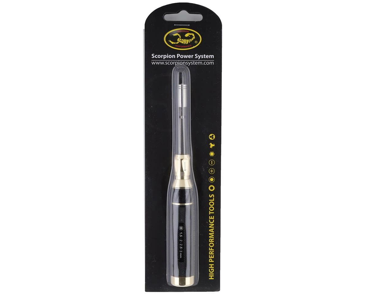 This is a Scorpion High Performance Multi-Bit Metric Hex Driver with 1.5, 2.0, 2.5, and 3.0mm tips. This multi-purpose tool is a great addition to any pit bag or workstation, with one single tool containing four different hex sizes and an adjustable shaft length for compact storage and use, as well as extended use for those hard to reach bolts.