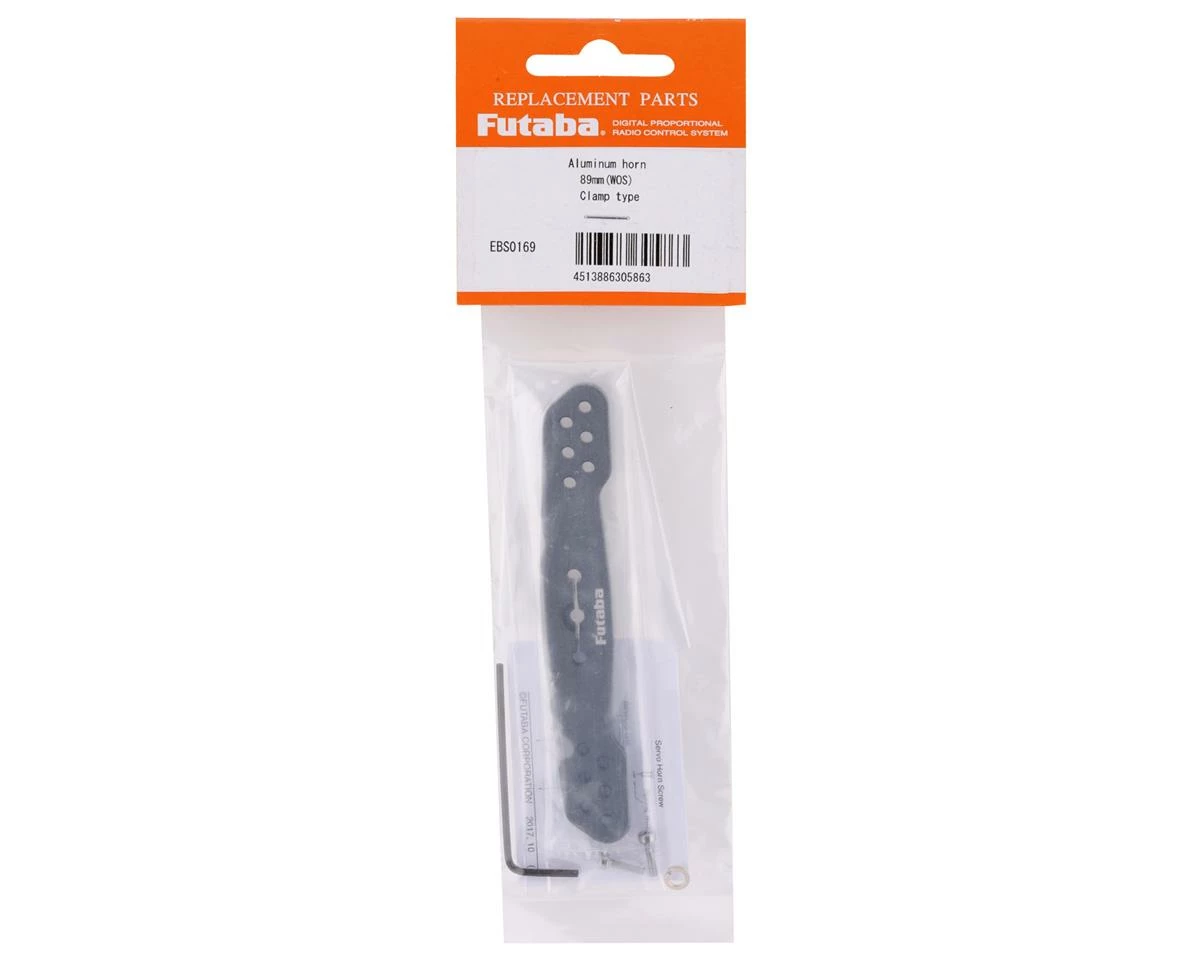 FutabaΒ 89mmΒ Aluminum Clamping Servo Horn. This optional servo horn is intended for servos equipped with a 25T servo spline. Package includes one servo horn, one clamp screw and one allen key.