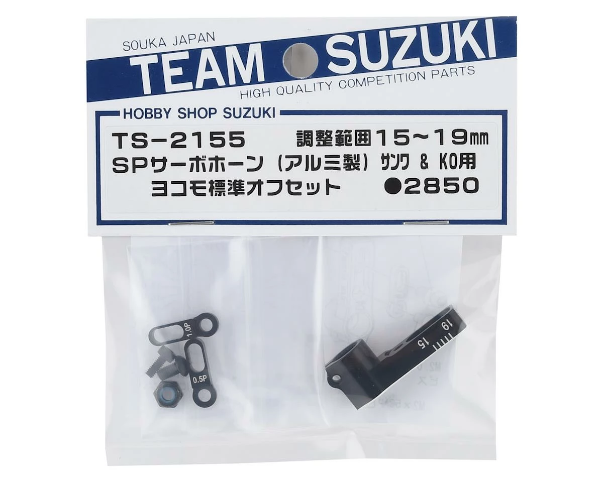 This is an optional Yokomo Team Suzuki Aluminum Adjustable SP Servo Horn, intended for use with Airtronics, Sanwa and KO Servos with 23 Tooth Splines. This is a high precision aluminum servo horn made by Team Suzuki that can be adjusted from 15mm to 19mm from the servo shaft center to the servo rod mounting pivot position. By changing the positioning frame, it can be set in 0.5mm increments. Two types of positioning frames, 0mm position standard and 0.5mm position standard, are attached, and mounting holes are set for each 1mm. These adjustments are finer and more accurate than the conventional servo horn, allowing for more detailed and specific adjustments of the steering and operation feel.