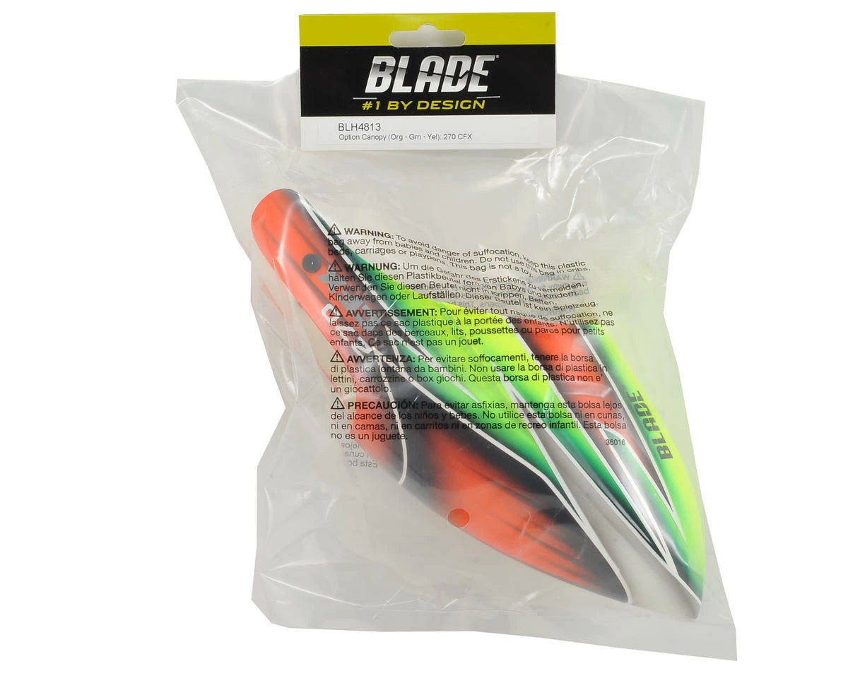 Blade 270 CFX Canopy. Package includes factory painted fiberglass canopy with pre-installed canopy grommets.Β