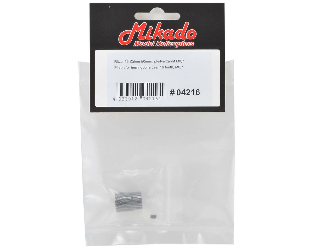 A replacement 16T M0.7 Herringbone Pinion Gear suited for use with the Mikado Logo series of helicopters. Supports 5mm Motor Shaft Diameters