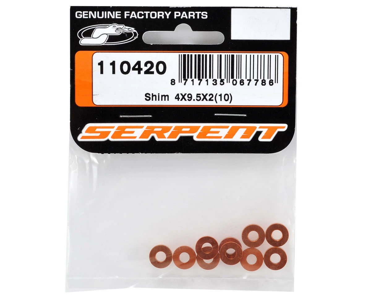 This is a pack of ten replacement Serpent 4×9.5x2mm Shims, and are intended for use with the Serpent S811 Cobra GT 1/8 on road car.
