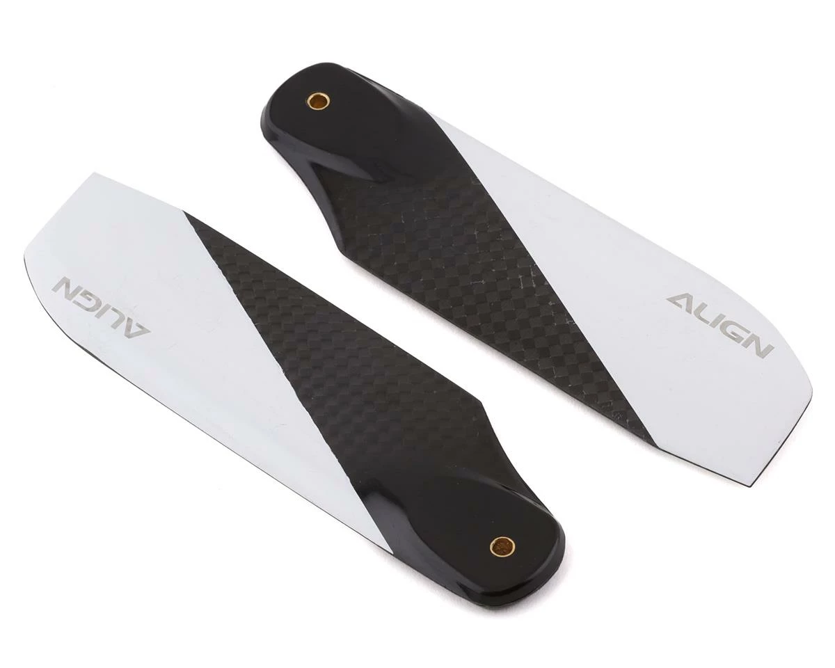 This is a set of Align 105mm Carbon Fiber Tail blades, with an updated style that offers improved visibility due to the larger white section found at the tip of the tail rotor blade. These are designed for the T-Rex 700 series of helicopters, but can be used with other helicopters that use this size of tail rotor blade.Β