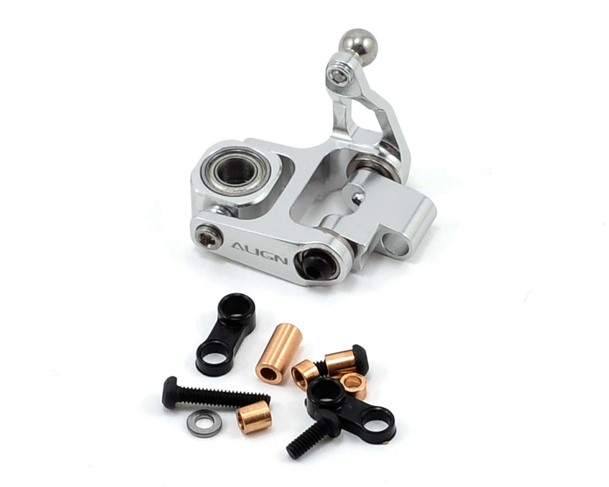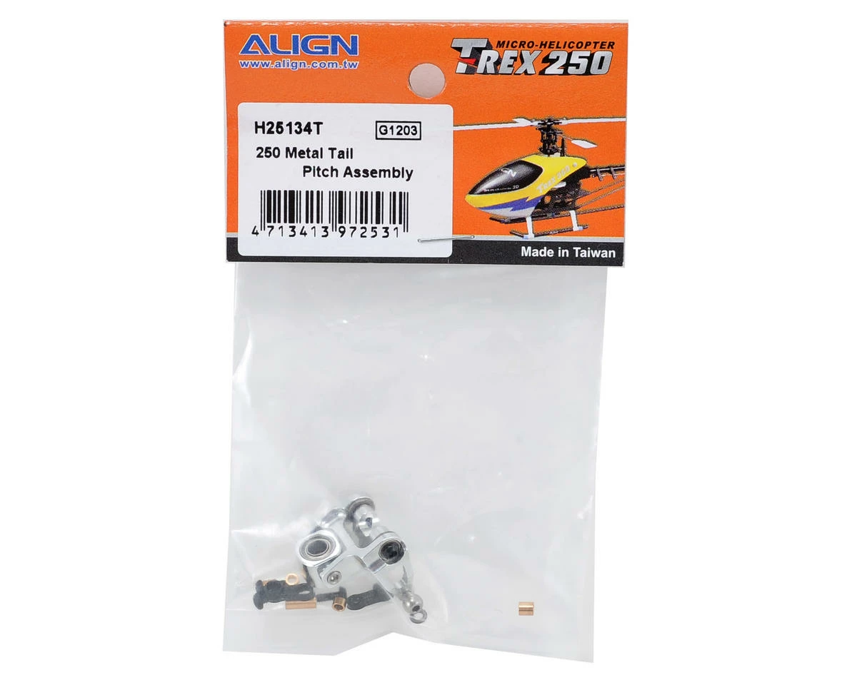 This is a replacement Align 250 Metal Tail Pitch Assembly, and is intended for use with the Align T-REX 250 Pro helicopter kit. This assembly is also an option part for the Align T-REX 250 helicopter kit equipped with the Align Metal Tail Torque Tube Unit (AGNH25129). This tail pitch assembly uses CNC 6061-T6 Aluminum and ball bearings offering improved rigidity to the 250 tail, providing a more precise and smoother rudder feel.
