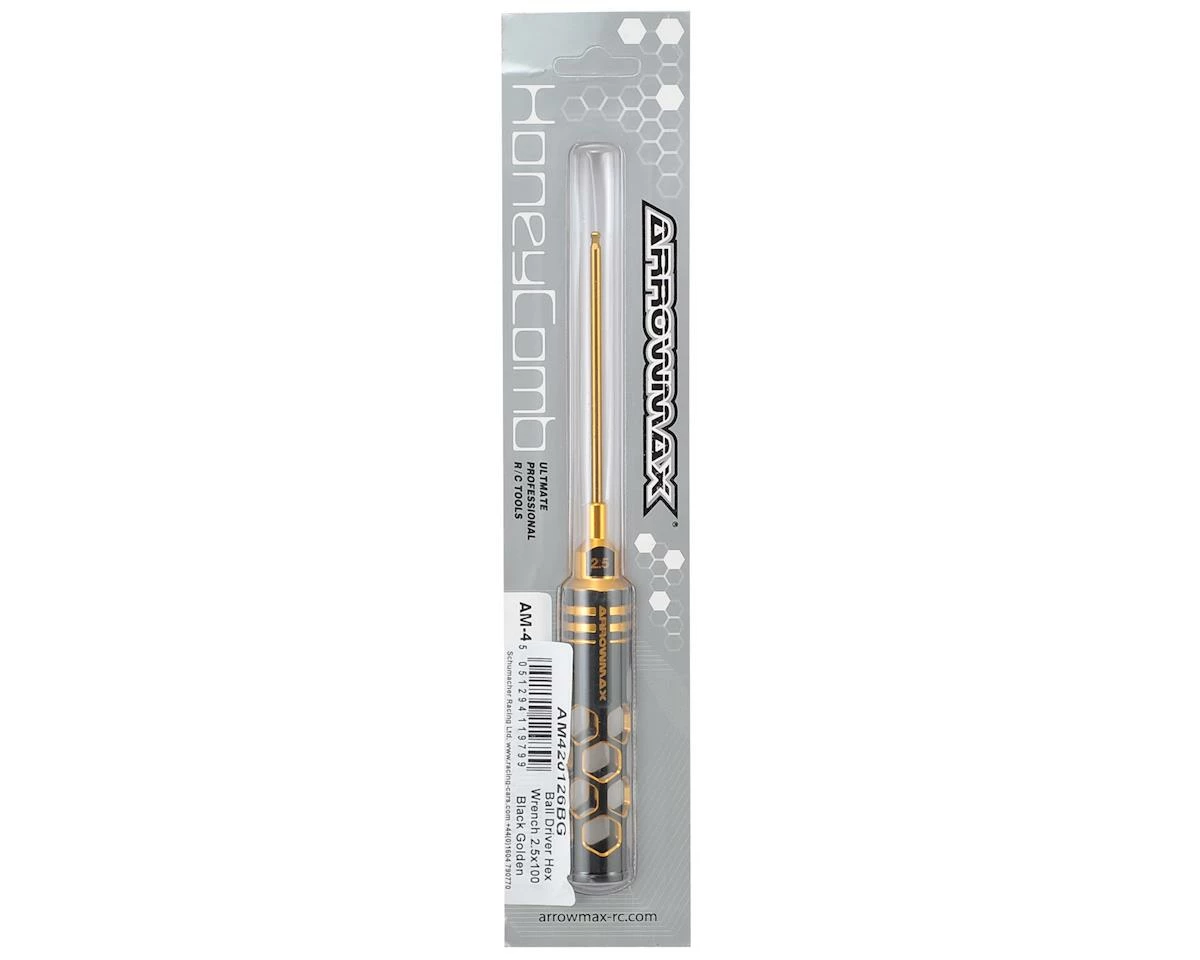 The Arrowmax Black Golden Ball End Hex Wrench is a limited edition tool that features an eye-catching hollow honeycomb handle design with a rich black and gold color finish. The 100mm long spring steel titanium nitride tip provides durability and long life, while a lexan end cap helps to create a more comfortable, controllable and lighter feeling tool that makes it easier to endure a long wrenching session. Package includes one 2.5mm ball end hex wrench.