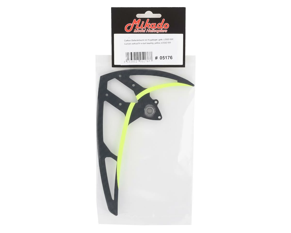 An optional Mikado Logo 550 Tail Fin, featuring a yellow painted accent.Β
