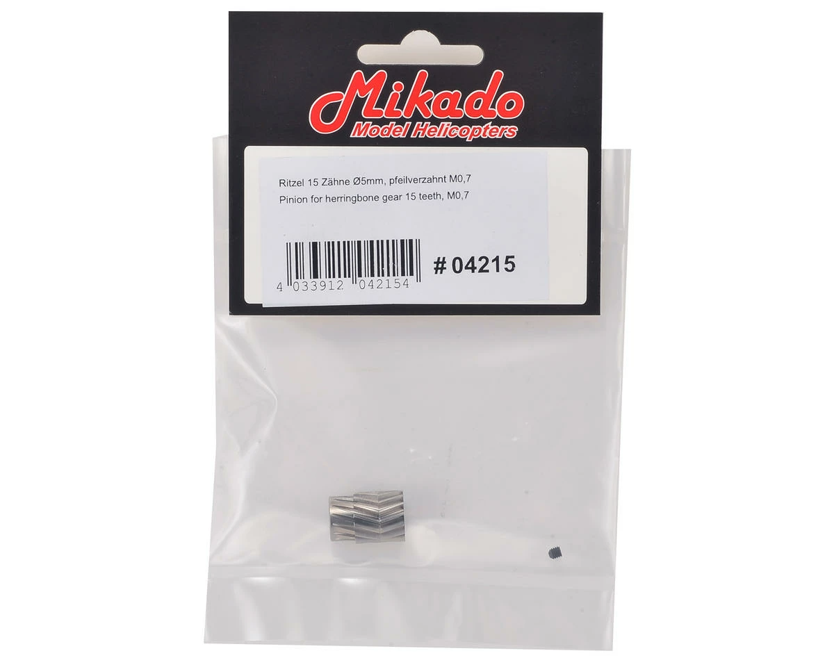 A replacement 15T M0.7 Herringbone Pinion Gear suited for use with the Mikado Logo series of helicopters. Supports 5mm Motor Shaft Diameters
