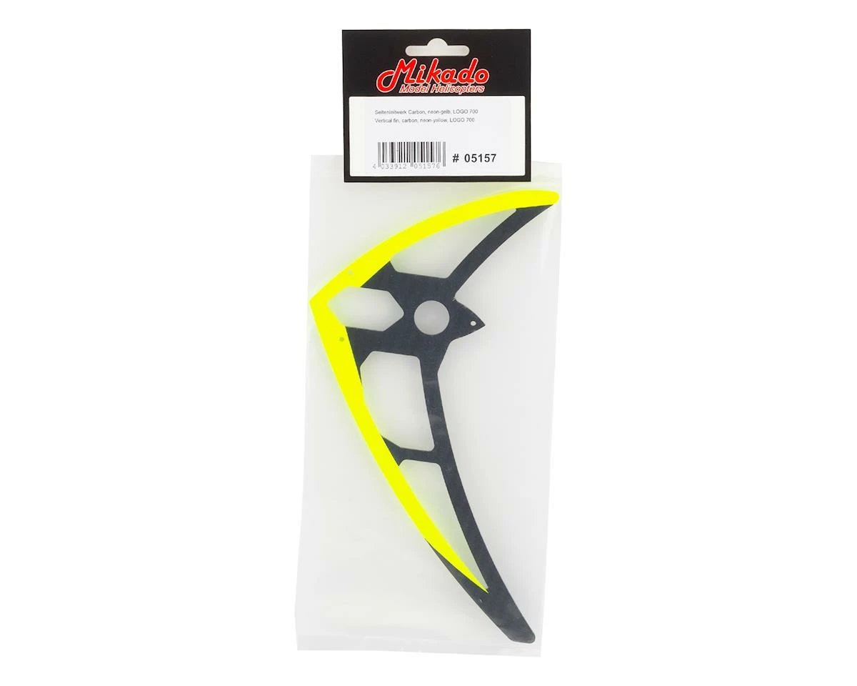 An optional Mikado Logo 700 Tail Fin, featuring a yellow painted accent.Β