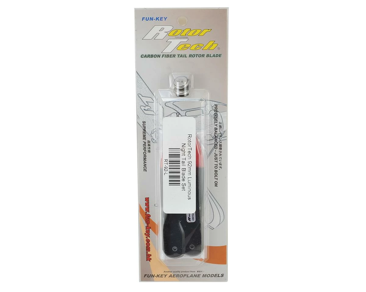 RotorTech blades are finely crafted premium carbon fiber rotor blades from Fun-Key Aeroplane Models. RotorTech blades are designed to be an all around powerful, efficient, well rounded performance oriented blade that will suite a large majority of flight styles from simple aerobatics, F3C, and extreme 3D flight. Additionally, RotorTech blades utilize a minimal amount of paint within the mold, while still providing excellent flight visibility. By using less weight on all of their blades, weight is saved on each set which offers a small boost in performance.Β Β