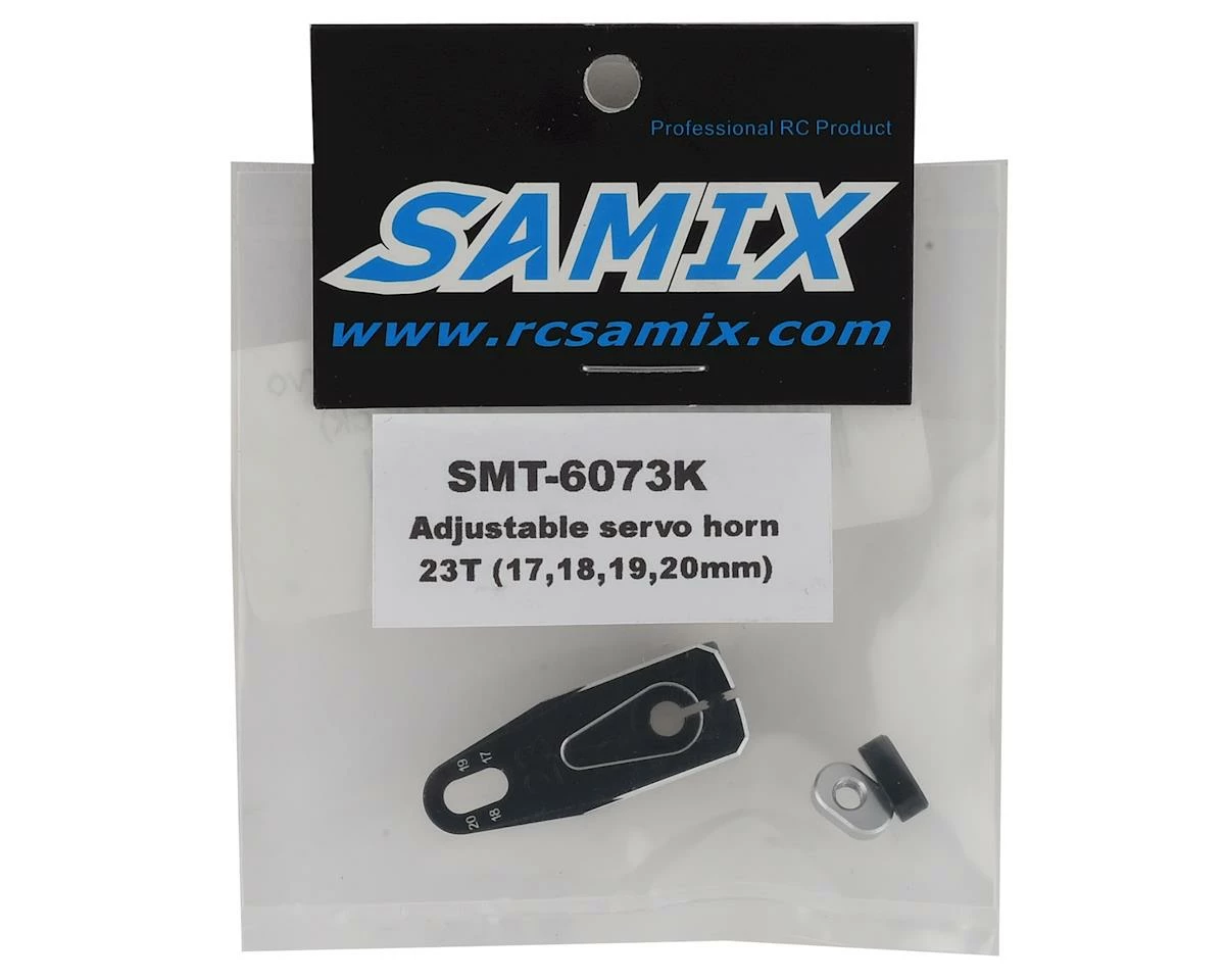 The Samix Aluminum Adjustable Servo Horn allows you to adjust the servo link mounting point on the servo horn in four increments – 17, 18, 19, and 20mm. This adjustment allows you to alter the feel and power of the steering. When mounted closer to the spline, it will create more mechanical torque. When mounted further from the spline, it will increase the speed and increase mechanical throw of the steering rack.Β