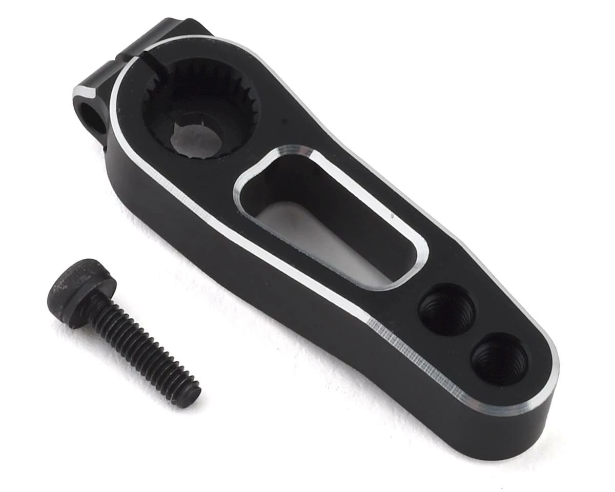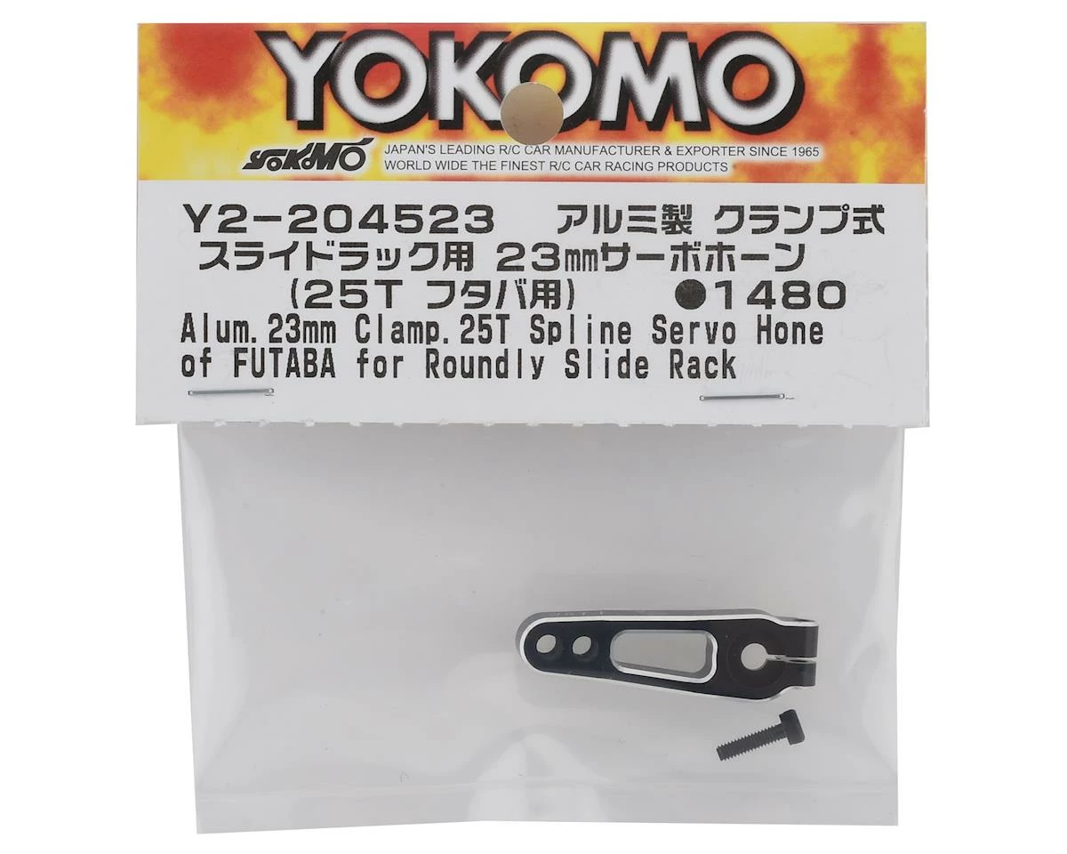 The optional Yokomo Aluminum Clamping Servo Horn for the Yokomo YD-2 is an aluminum servo horn that allows more direct operation of the servo. The distance from the servo output shaft to the center of the pillow ball attachment hole at the tip is 23mm, and matches the servo shaft spline (25T) made by Futaba and ProTek. It is the best size for touring cars. This part has been anodized black with chamfered edges for added strength and style.