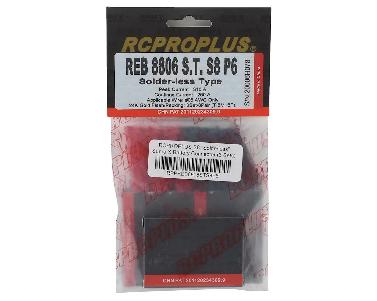 The RC Pro Plus S8 “Solderless” Supra X Battery Connector continues to push RCPP to the forefront of battery connector development. Providing high quality, and high reliability, RCPP has quickly became a leader within the industry.ย Solderless connetors?ย Absolutely! Solderless connections are commonly found in high current applications outside the R/C industry, and inherently provide lower point of fatigue within the connection.ย