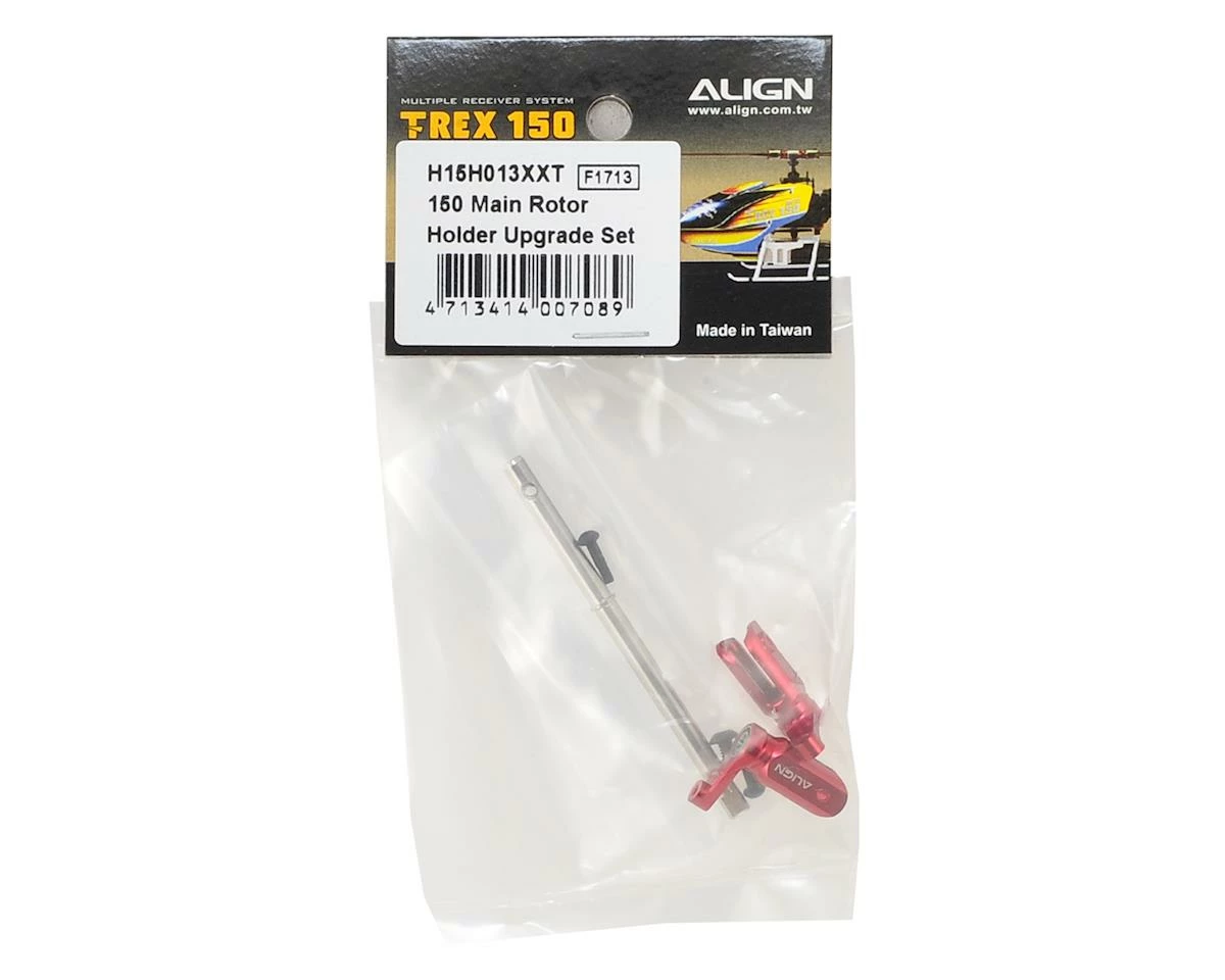 The Align T-Rex 150 Main Rotor Holder Upgrade set enhances the T-Rex 150 flying characteristics by incorporating a taller main shaft (raised 1.5mm), extending out the main grip arms 1.2mm, and lastly modifying the angle of attack on the grip arm from 7.5mm to 8.4mm at an 80 degree angle.