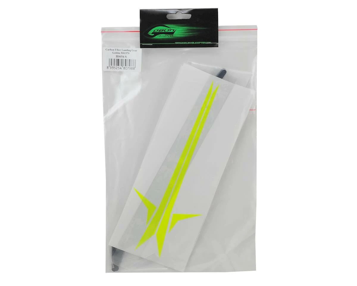 A replacement Carbon Fiber Landing Gear set from SAB, suited for use with the Goblin 500 Sport helicopter. Includes a set of white & a set of yellow stickers for improved aesthetics.