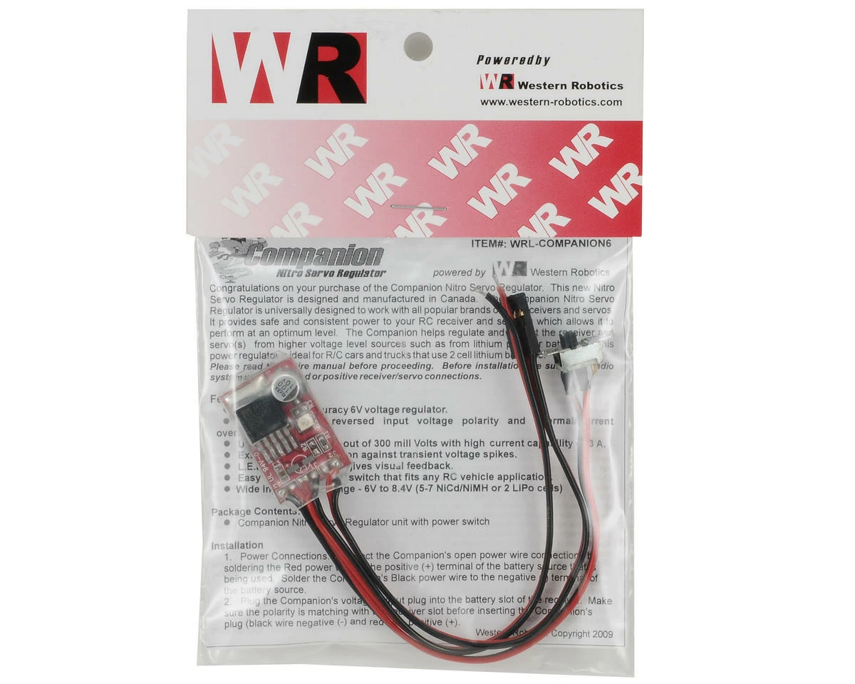This is the Western Robotics Companion Nitro Servo Regulator. The Companion Nitro Servo Regulator is universally designed to work with all popular brands of R/C receivers and servos. It provides safe and consistent power to your receiver and servo(s), allowing them to perform at optimum levels. The Companion helps regulate and protect the receiver and servo(s) from high voltage input levels, allowing your electronics to operate safely with lithium polymer batteries. It is also equipped with a servo plug that provides easy installation to your R/C receiver. This power regulator is ideal for R/C cars and trucks that use 2S lithium polymer receiver batteries.