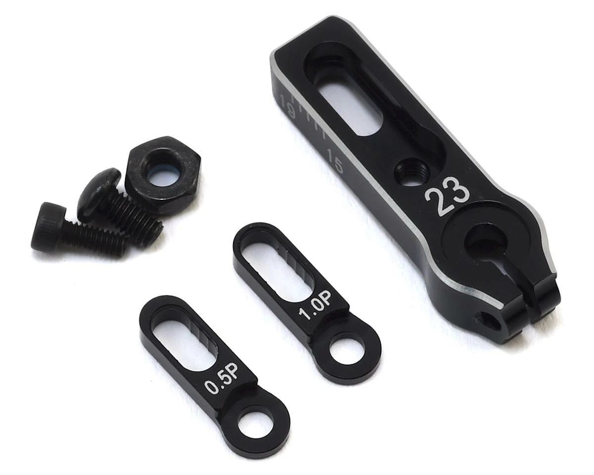This is the optional Yokomo Team Suzuki Aluminum Adjustable Servo Horn, for use with 23 Tooth splines; such as Sanwa and KO servos. This high precision aluminum servo horn provides adjustability between 15mm and 19mm, with adjustability in 0.5mm increments with the use of insert frames. There are two types of positioning frames, 0.0mm position reference and 0.5mm position reference, and mounting holes are set for 1mm each.