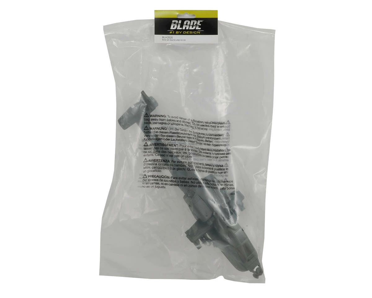 Blade AH-64 Apache Body Set. Package includes AH-64 body, complete with factory installed landing gear wheels and LED lights.
